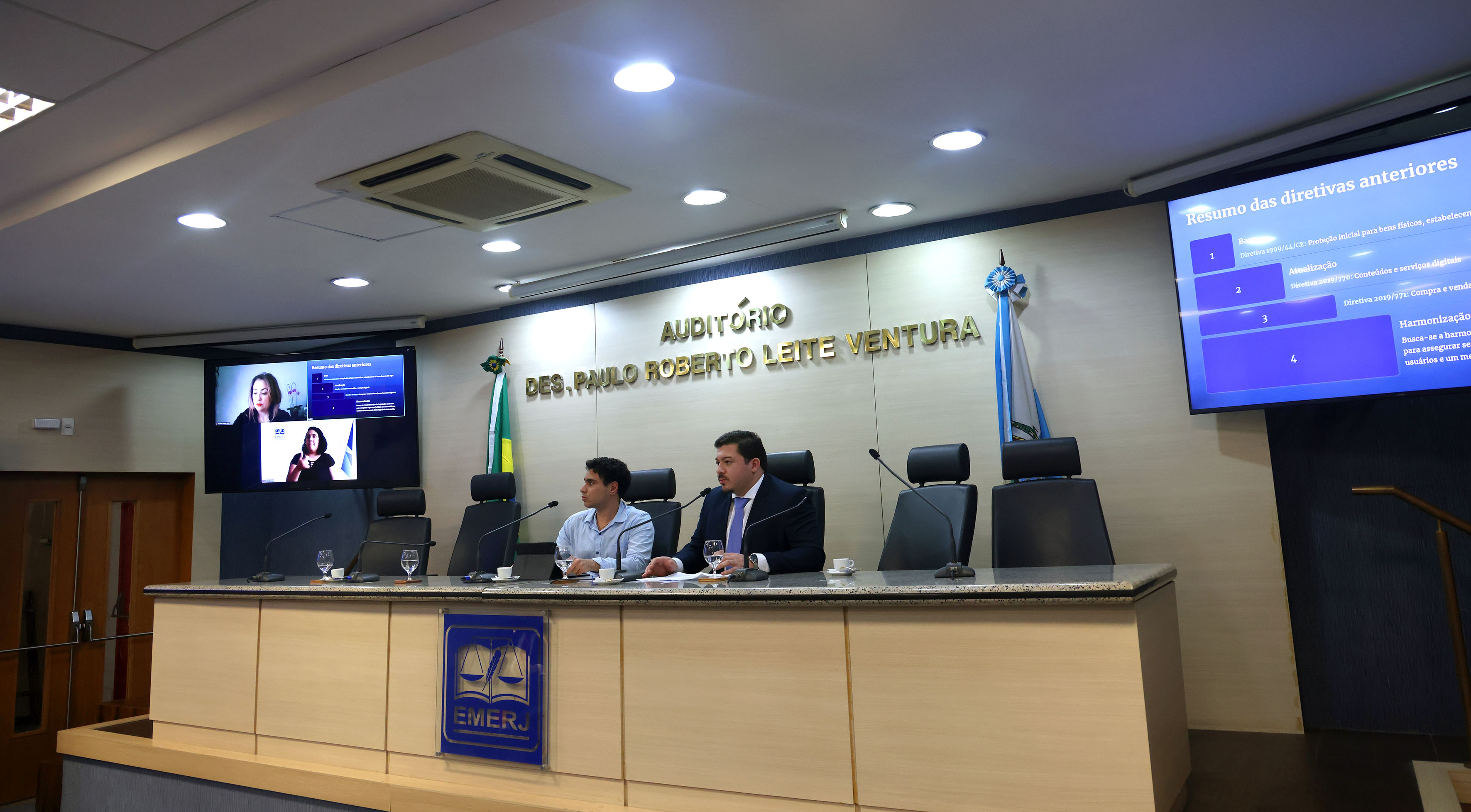 Na sequência, a Dra. Karina Cristina Nunes Fritz enfatizou: “Eu gostaria de agradecer à EMERJ pela oportunidade de participar do NUPEDICOM, esse núcleo de pesquisa que tem como objetivo analisar temas relevantes para o Direito brasileiro sob uma perspectiva comparada. Neste ano, escolhemos como foco os contratos digitais. Iniciamos o estudo no ano passado e o mantivemos para este ano, buscando analisar, de forma comparada, como a União Europeia tem disciplinado esses contratos. Mas por que escolhemos focar no direito europeu? Porque a União Europeia vem se destacando no cenário internacional como um bloco que tem imposto uma regulamentação mais robusta às atividades das plataformas digitais como um todo.”