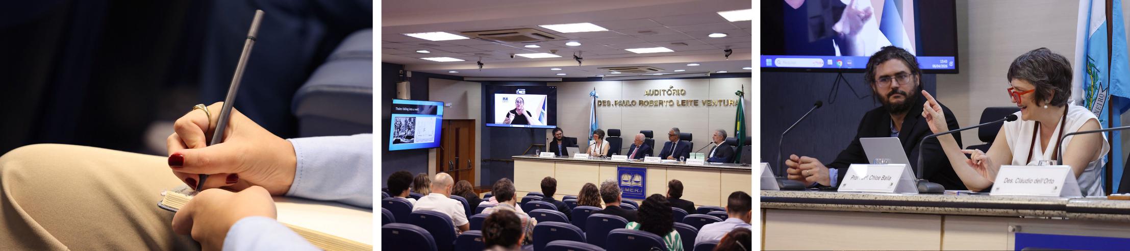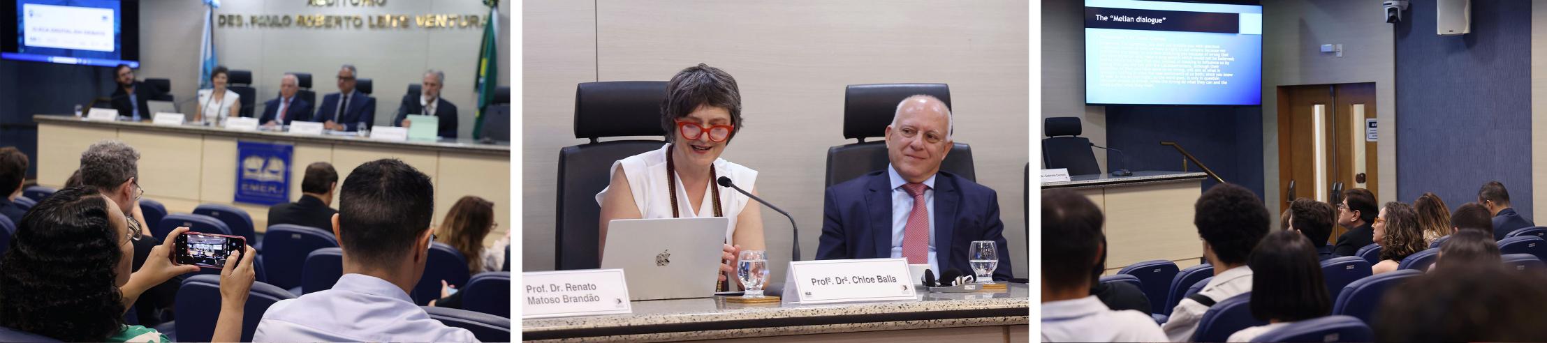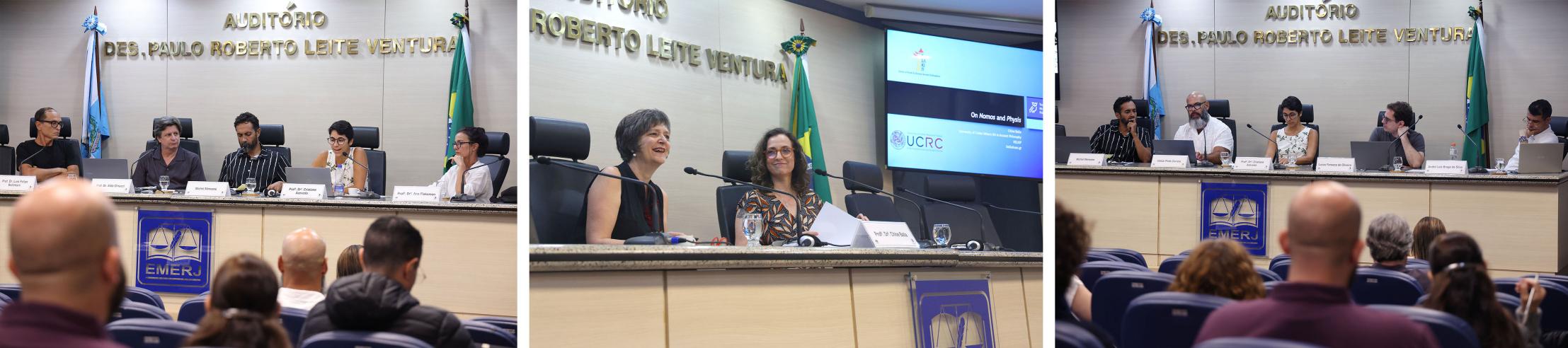 A abertura do evento ficou a cargo do diretor-geral da EMERJ, o desembargador Cláudio dell’Orto, que destacou: “Eu quero dizer que é uma honra enorme para a Escola da Magistratura do Rio de Janeiro participar desse programa com a UnB, a PUC-Rio, o Programa de Pós-Graduação da Universidade Brasília, o CNPQ, todas as entidades que integram essa programação e, em especial, um agradecimento muito afetuoso ao querido amigo, professor doutor Carlos Gustavo Direito. Agradeço também as parcerias do professor doutor Gabriele Cornelli e do Dr. Renato Matoso Brandão. De modo especial, é uma alegria enorme receber a professora doutora Chloe Balla para essa oportunidade de aperfeiçoamento das questões vinculadas ao Direito e à Filosofia.”