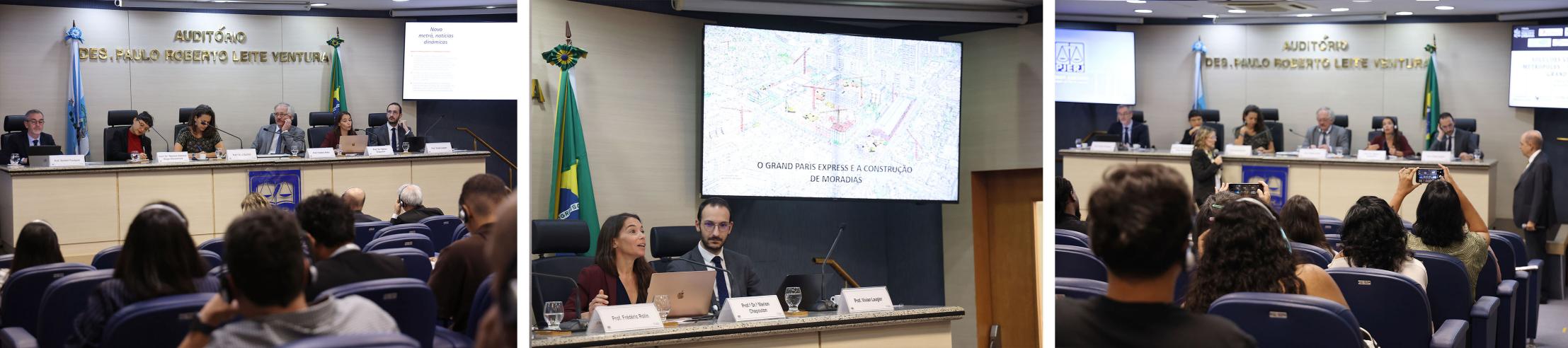 A doutora em Direito Público pela Université Paris II Panthéon-Assas e membro do GRIDAUH, Marion Chapouton, manifestou: “Eu vou falar do tema Grand Paris Express e construção de moradias. É um projeto de transporte, mas também de política de moradia. É um projeto de interesse nacional estruturante. A lei relativa ao Grand Paris Express, de 2010, diz que é um projeto urbano, social e econômico de interesse nacional. São três pilares dessa lei. O primeiro é uma infraestrutura como armadura urbana. O Grand Paris Express representa 200 km de metrô, 68 estações e até 3 milhões de passageiros por dia. Essas 68 novas estações formam pontos de apoio para os projetos de planificação de novos bairros. O desafio é essa centralidade urbana. O segundo pilar é a criação da sociedade do Grand Paris Express, que vai administrar a rede. O terceiro pilar é o contrato de desbloqueamento territorial, visando coordenar urbanismo, transporte, desenvolvimento urbano ao redor das estações e também a construção das moradias sociais.”